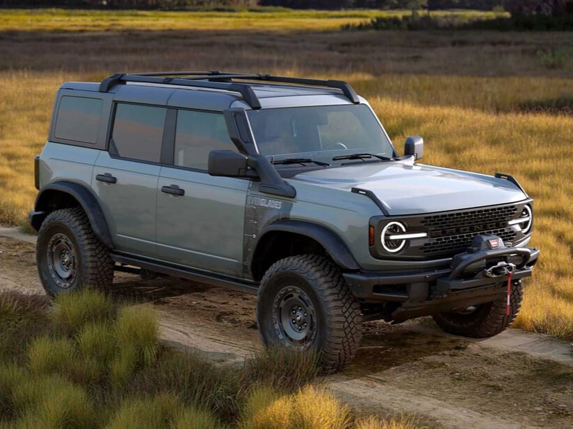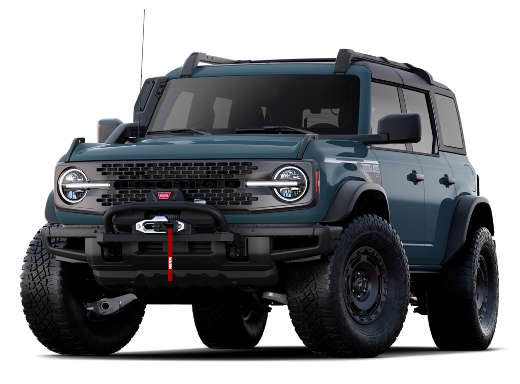 The Bronco's design pays tribute to its legendary heritage while integrating modern craftsmanship and technology. The bold, upright stance, classic round headlamps, and square grille are distinctly Bronco. Removable doors and roof allow you to feel immersed in the outdoors. On the inside, marine-grade vinyl seating, rubberized washable floors with integrated drains, and durable grab handles prepare the cabin for your muddy gear and weekend warrior-ing.